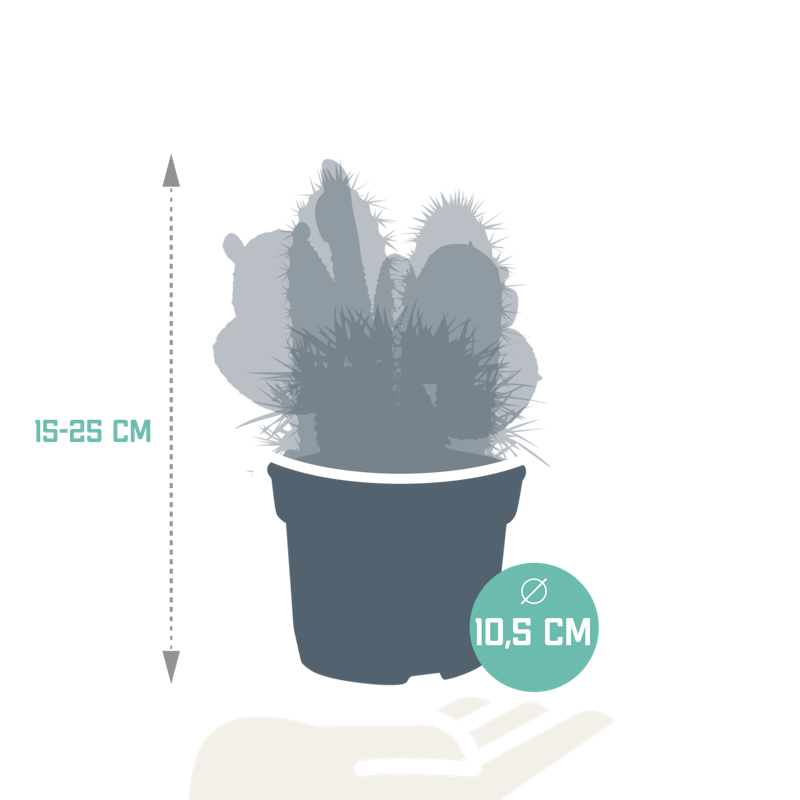 Deze cactus mix bestaat uit 3 cactussen die in kleur, hoogte en vorm van elkaar verschillen. De cactussen zijn met zorg opgekweekt in een kweekpot met een diameter van 12 cm. De hoogte van de cactussen ligt tussen de 18 en 27 cm. De cactus is eenvoudig te verzorgen. De cactus staat graag op een lichte plaats én kan zelfs in de volle zon staan. De cactus heeft in de groeiperiode van maart t/m september 1x per 2 weken water nodig. In de rustperiode van oktober t/m februari is 1x per maand water geven voldoende. Zorg ervoor dat de grond tussen de waterbeurten goed is uitgedroogd.