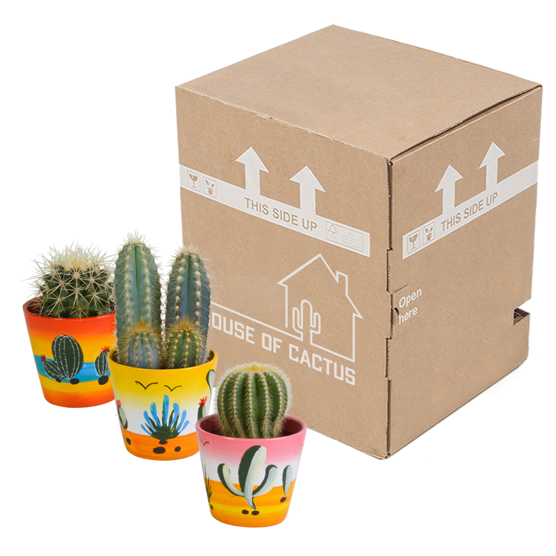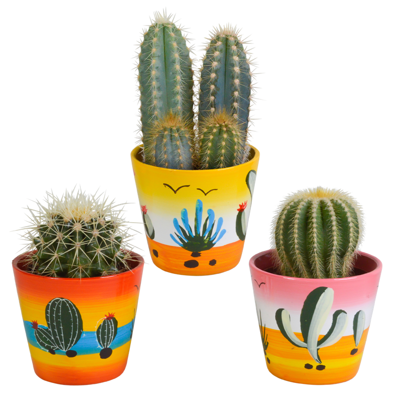 Deze cactus mix bestaat uit 3 cactussen die in kleur, hoogte en vorm van elkaar verschillen. De cactussen worden geleverd in een handgeschilderde Mexicaanse pot. De cactussen zijn met zorg opgekweekt in een kweekpot met een diameter van 8,5 cm. De hoogte van de cactussen, inclusief sierpot, ligt tussen de 13 en 18 cm. De cactus is eenvoudig te verzorgen. De cactus staat graag op een lichte plaats én kan in de zon staan. De cactus heeft in de groeiperiode van maart t/m september 1x per 2 weken water nodig. In de rustperiode van oktober t/m februari is 1x per maand water geven voldoende. Zorg ervoor dat de grond tussen de waterbeurten goed is uitgedroogd.