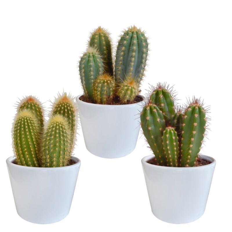 Deze Cereus mix bestaat uit 3 Cereussen die in kleur, hoogte en vorm van elkaar verschillen. De Cereussen worden geleverd in een witte pot. De Cereussen zijn met zorg opgekweekt in een kweekpot met een diameter van 10,5 cm. De hoogte van de Cereussen, inclusief sierpot, ligt tussen de 18 en 23 cm. De Cereus is eenvoudig te verzorgen. De Cereus staat graag op een lichte plaats én kan in de zon staan. De Cereus heeft in de groeiperiode van maart t/m september 1x per 2 weken water nodig. In de rustperiode van oktober t/m februari is 1x per maand water geven voldoende. Zorg ervoor dat de grond tussen de waterbeurten goed is uitgedroogd.