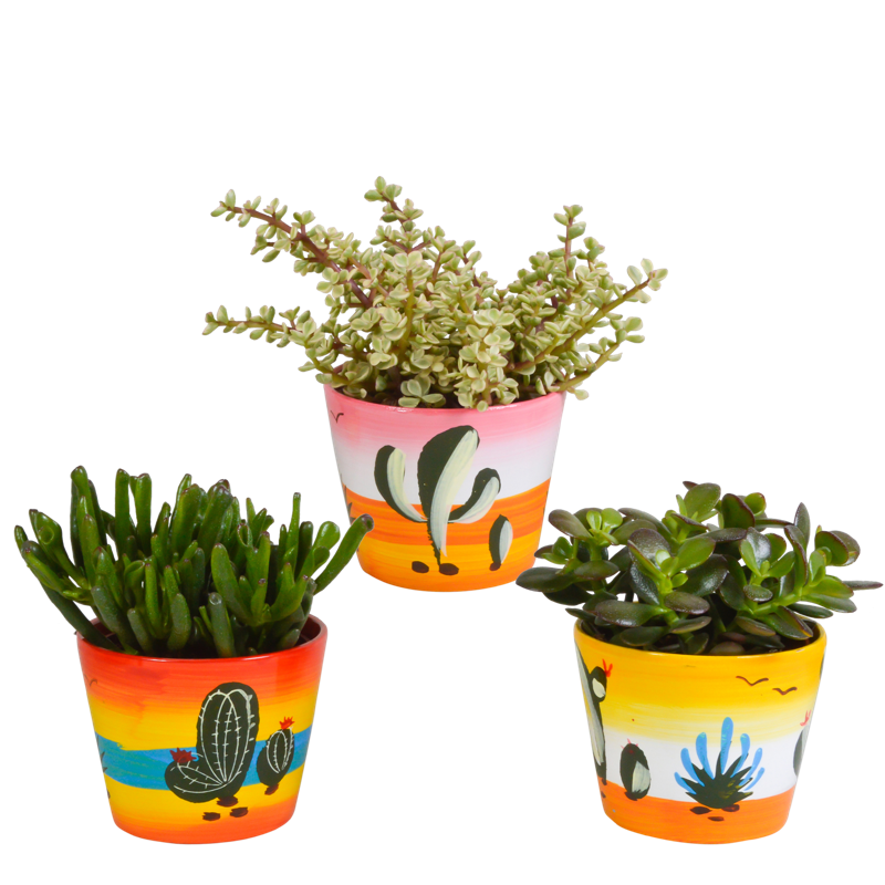 Deze Crassula mix bestaat uit 3 Crassula’s die in kleur, hoogte en vorm van elkaar verschillen. De Crassula’s worden geleverd in een handgeschilderde Mexicaanse pot. De Crassula’s zijn met zorg opgekweekt in een kweekpot met een diameter van 10,5 cm. De hoogte van de Crassula’s, inclusief sierpot, ligt tussen de 16 en 21 cm. De Crassula is eenvoudig te verzorgen. De Crassula staat graag op een lichte plaats én kan in de zon staan. De Crassula heeft in de groeiperiode van maart t/m september 1x per 2 weken water nodig. In de rustperiode van oktober t/m februari is 1x per maand water geven voldoende. Zorg ervoor dat de grond tussen de waterbeurten goed is uitgedroogd.