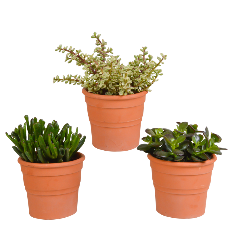 Deze Crassula mix bestaat uit 3 Crassula’s die in kleur, hoogte en vorm van elkaar verschillen. De Crassula’s worden geleverd in een terracotta pot. De Crassula’s zijn met zorg opgekweekt in een kweekpot met een diameter van 10,5 cm. De hoogte van de Crassula’s, inclusief sierpot, ligt tussen de 16 en 21 cm. De Crassula is eenvoudig te verzorgen. De Crassula staat graag op een lichte plaats én kan in de zon staan. De Crassula heeft in de groeiperiode van maart t/m september 1x per 2 weken water nodig. In de rustperiode van oktober t/m februari is 1x per maand water geven voldoende. Zorg ervoor dat de grond tussen de waterbeurten goed is uitgedroogd.