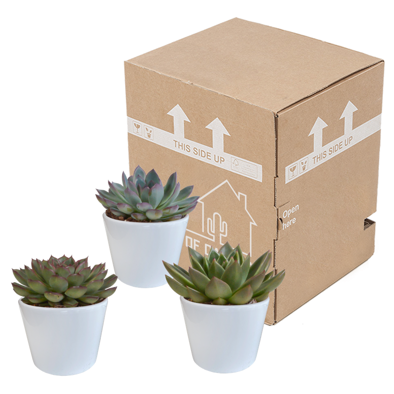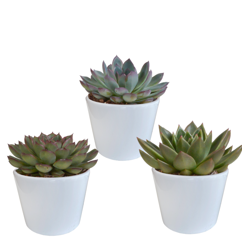 Deze Echeveria mix bestaat uit 3 Echeveria’s die in kleur van elkaar verschillen. De Echeveria’s worden geleverd in een witte pot. De Echeveria’s zijn met zorg opgekweekt in een kweekpot met een diameter van 10,5 cm. De hoogte van de Echeveria’s, inclusief sierpot, ligt tussen de 16 en 21 cm. De Echeveria is eenvoudig te verzorgen. De Echeveria staat graag op een lichte plaats én kan in de zon staan. De Echeveria heeft in de groeiperiode van maart t/m september 1x per 2 weken water nodig. In de rustperiode van oktober t/m februari is 1x per maand water geven voldoende. Zorg ervoor dat de grond tussen de waterbeurten goed is uitgedroogd.
