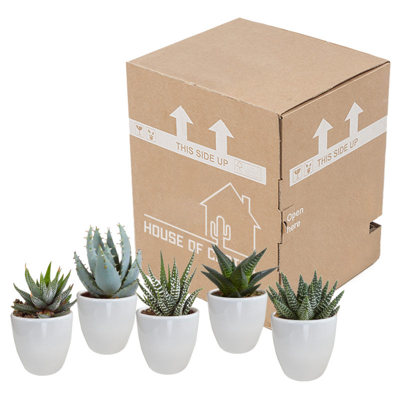 Deze Gasteria/Haworthia mix bestaat uit 5 vetplanten die in kleur, hoogte en vorm van elkaar verschillen. De Gasteria’s/Haworthia’s worden geleverd in een witte pot. De Gasteria’s/Haworthia’s zijn met zorg opgekweekt in een kweekpot met een diameter van 5,5 cm. De hoogte van de Gasteria’s/Haworthia’s ligt tussen de 8 en 13 cm. De Gasteria/Haworthia is eenvoudig te verzorgen. De Gasteria/Haworthia staat graag op een lichte plaats én kan in de zon staan. De Gasteria/Haworthia heeft in de groeiperiode van maart t/m september 1x per 2 weken water nodig. In de rustperiode van oktober t/m februari is 1x per maand water geven voldoende. Zorg ervoor dat de grond tussen de waterbeurten goed is uitgedroogd.