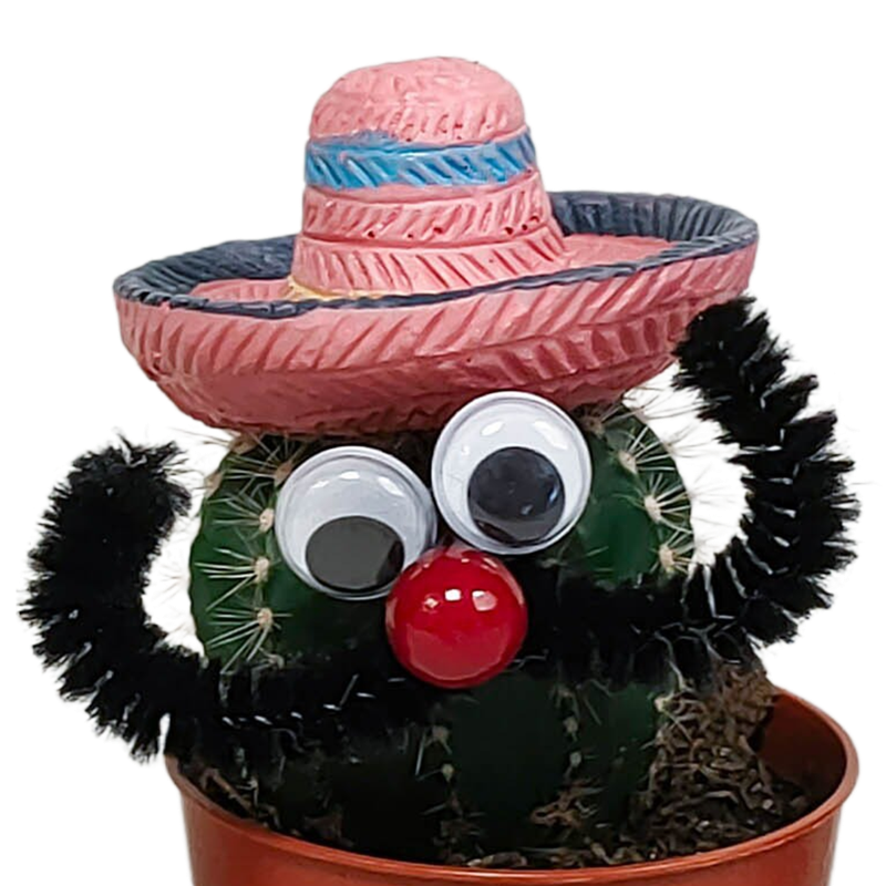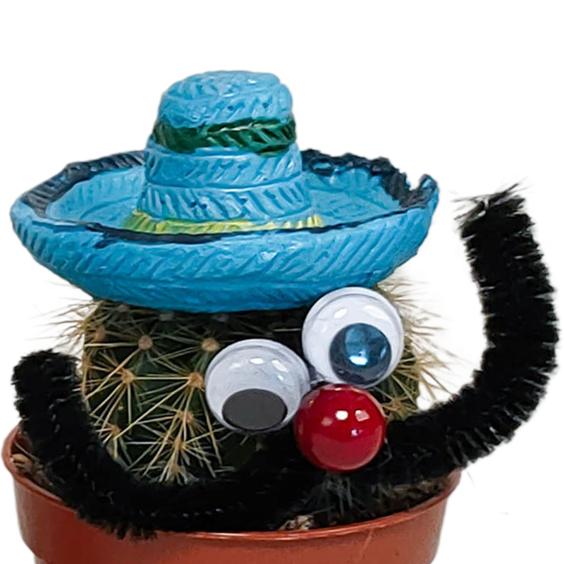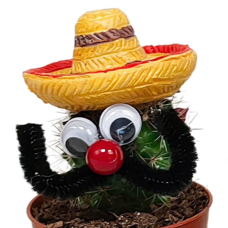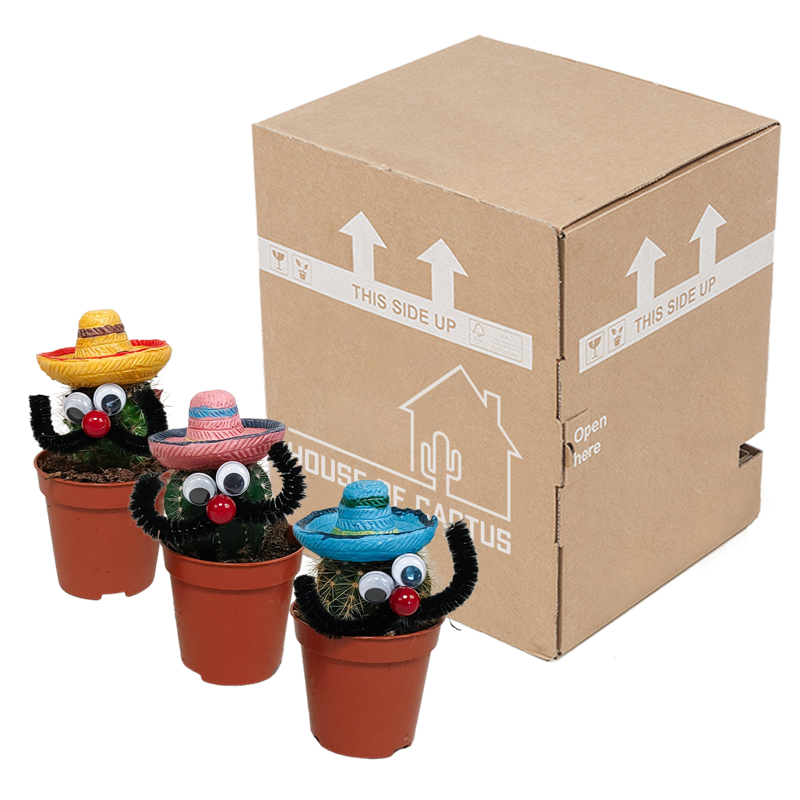 Deze Mexicaanse cactus bestaat uit 3 cactussen, voorzien van sombrero, ogen en een snor, die in kleur van elkaar verschillen. De cactussen zijn met zorg opgekweekt in een kweekpot met een diameter van 5,5 cm. De hoogte van de cactussen ligt tussen de 10 en 15 cm. De cactus is eenvoudig te verzorgen. De cactus staat graag op een lichte plaats én kan zelfs in de zon staan. De cactus heeft in de groeiperiode van maart t/m september 1x per 2 weken water nodig. In de rustperiode van oktober t/m februari is 1x per maand water geven voldoende. Zorg ervoor dat de grond tussen de waterbeurten goed is uitgedroogd.