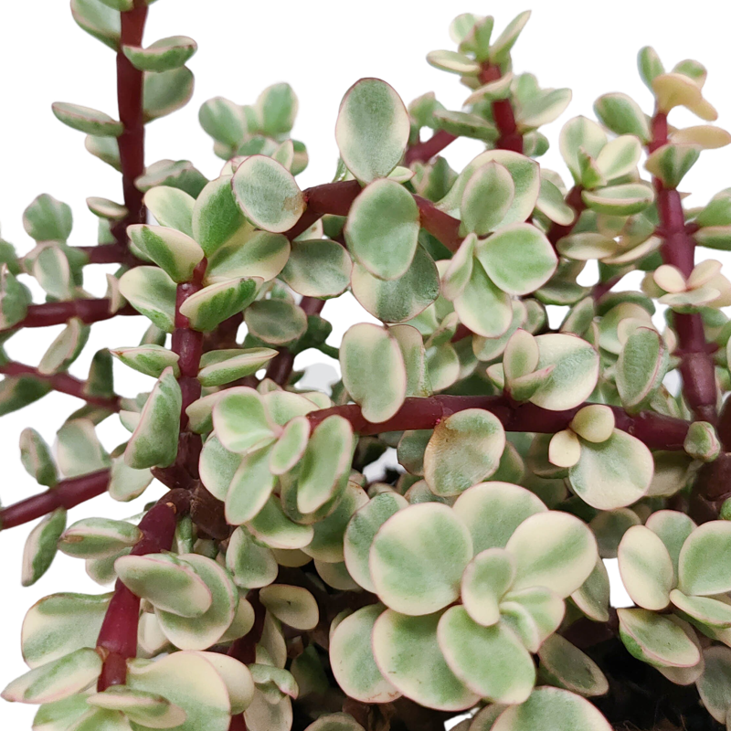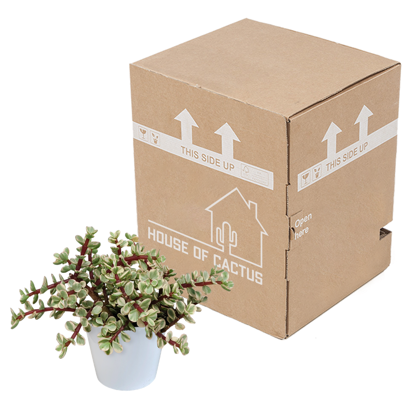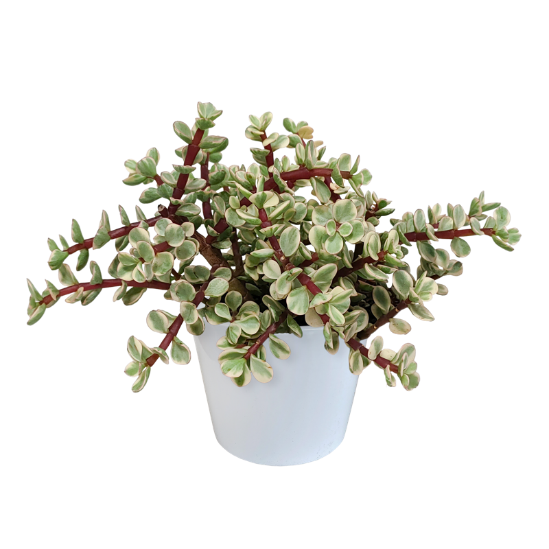 De Portulacaria afra Variegata beschikt over kleine gele bladeren met een rode stam. De Portulacaria wordt geleverd in een witte pot. De Portulacaria is met zorg opgekweekt in een kweekpot met een diameter van 10,5 cm. De hoogte van de Portulacaria ligt tussen de 18 en 25 cm. De Portulacaria is eenvoudig te verzorgen. De Portulacaria staat graag op een lichte plaats én kan in de zon staan. De Portulacaria heeft in de groeiperiode van maart t/m september 1x per 2 weken water nodig. In de rustperiode van oktober t/m februari is 1x per maand water geven voldoende. Zorg ervoor dat de grond tussen de waterbeurten goed is uitgedroogd.