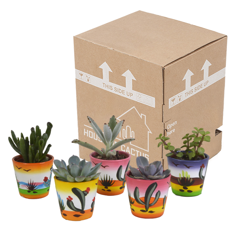 Deze vetplanten mix bestaat uit 5 vetplanten die in kleur, hoogte en vorm van elkaar verschillen. De vetplanten worden geleverd in een handgeschilderde Mexicaanse pot. De vetplanten zijn met zorg opgekweekt in een kweekpot met een diameter van 5,5 cm. De hoogte van de vetplanten, inclusief sierpot, ligt tussen de 8 en 13 cm. De vetplant is eenvoudig te verzorgen. De vetplant staat graag op een lichte plaats én kan in de zon staan. De vetplant heeft in de groeiperiode van maart t/m september 1x per 2 weken water nodig. In de rustperiode van oktober t/m februari is 1x per maand water geven voldoende. Zorg ervoor dat de grond tussen de waterbeurten goed is uitgedroogd.